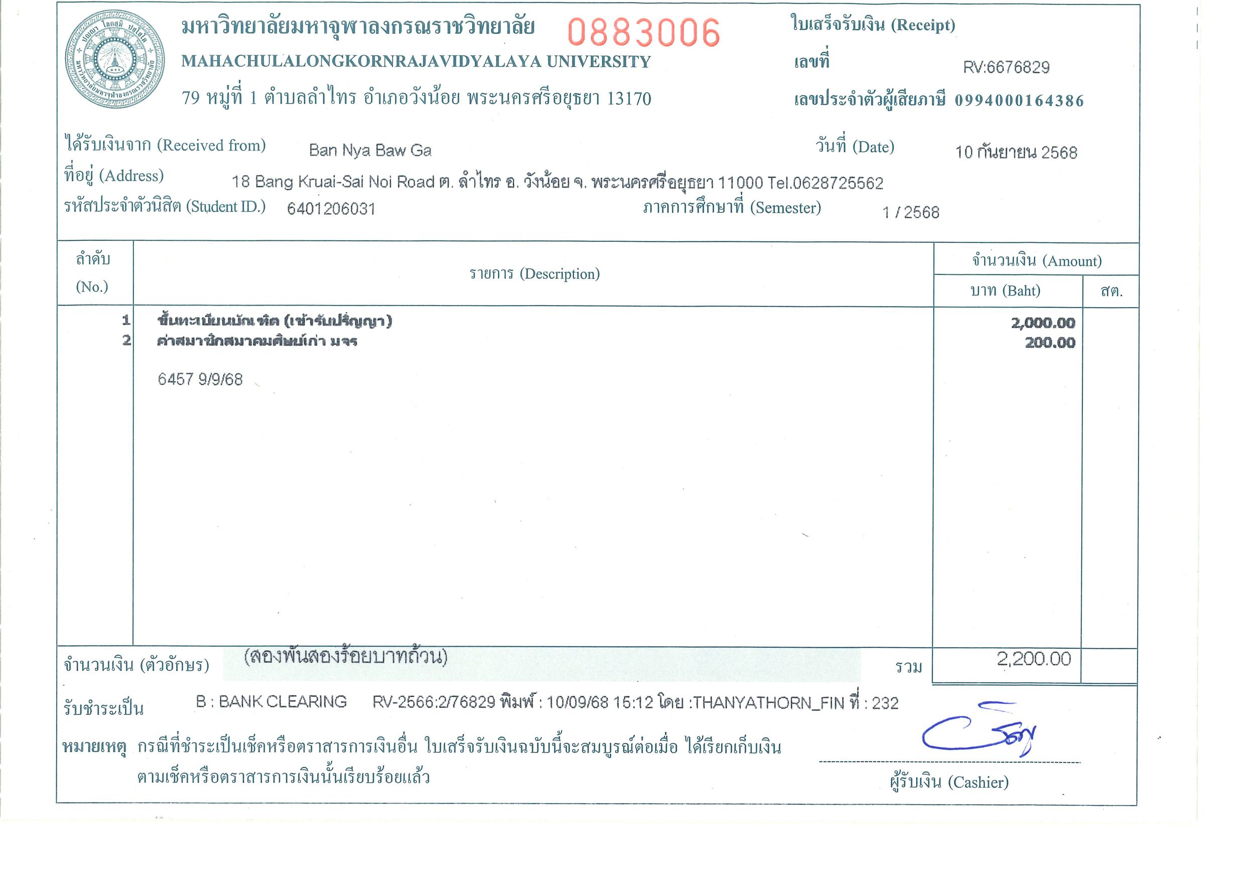 | รหัสนิสิต : 6401206031 | ชื่อ : Ban Nya Baw Ga | ฉายา: - | นามสกุล: - |