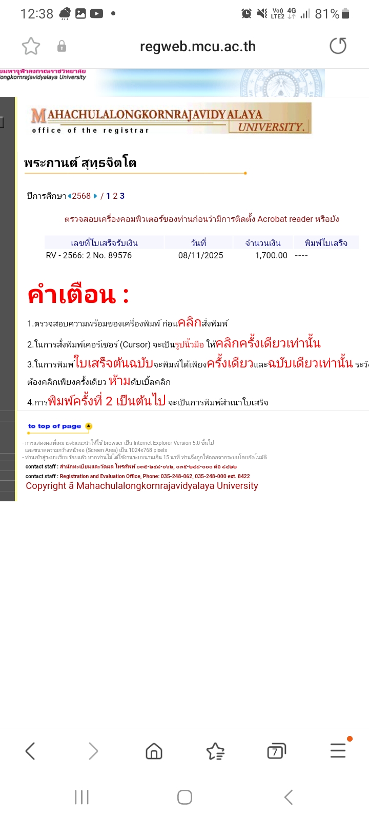 | สถานะเข้าพิธีประสาทปริญญา : บรรพชิต | ระดับ : ปริญญาตรี | สังกัดคณะ: คณะพุทธศาสตร์ | สาขาวิชา: วิปัสสนาภาวนา |