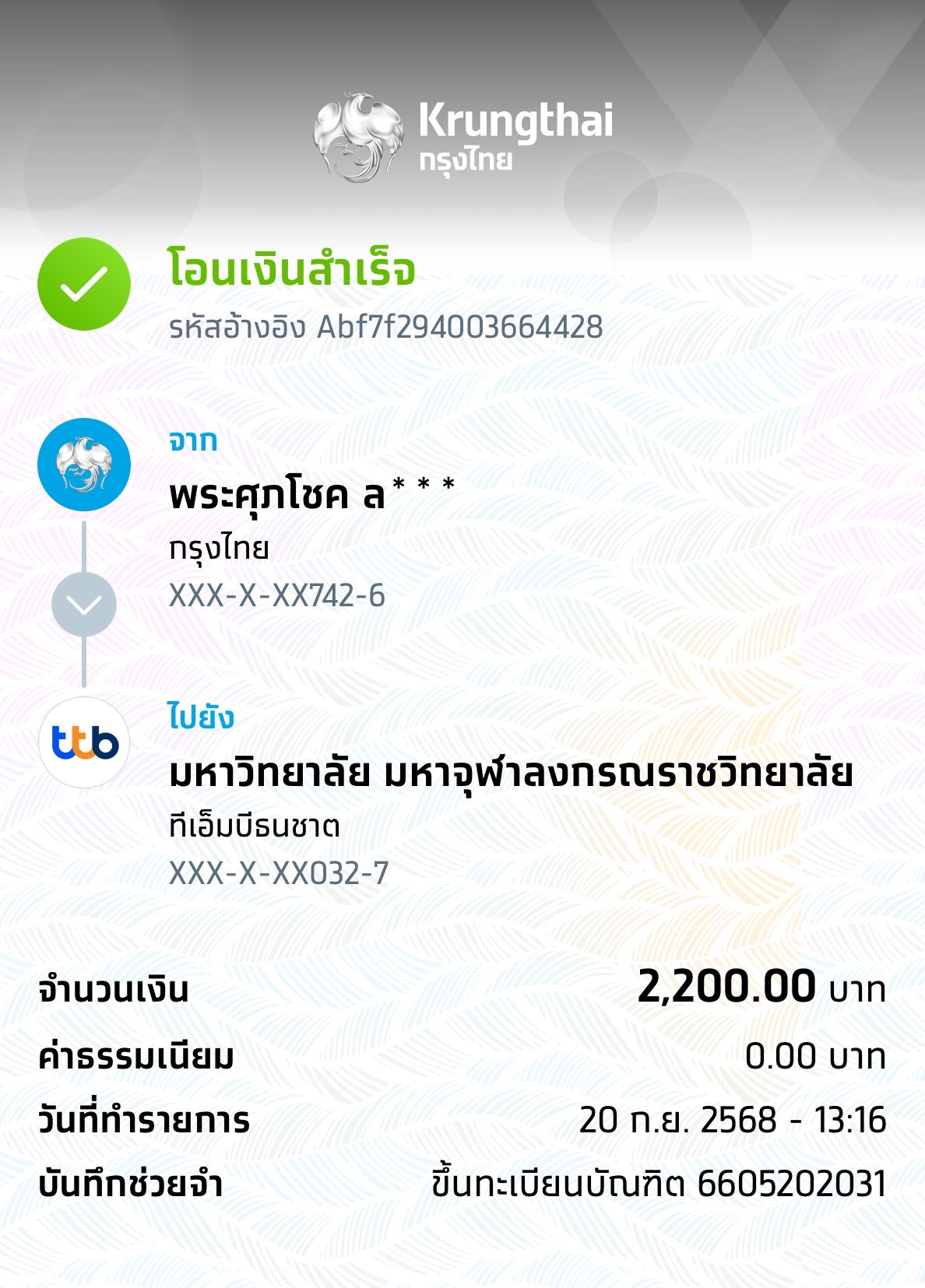 รหัสนิสิต : 6605202031 ชื่อ : พระศุภโชค ฉายา: สุนฺทรธมฺโม นามสกุล: ล้านแสน