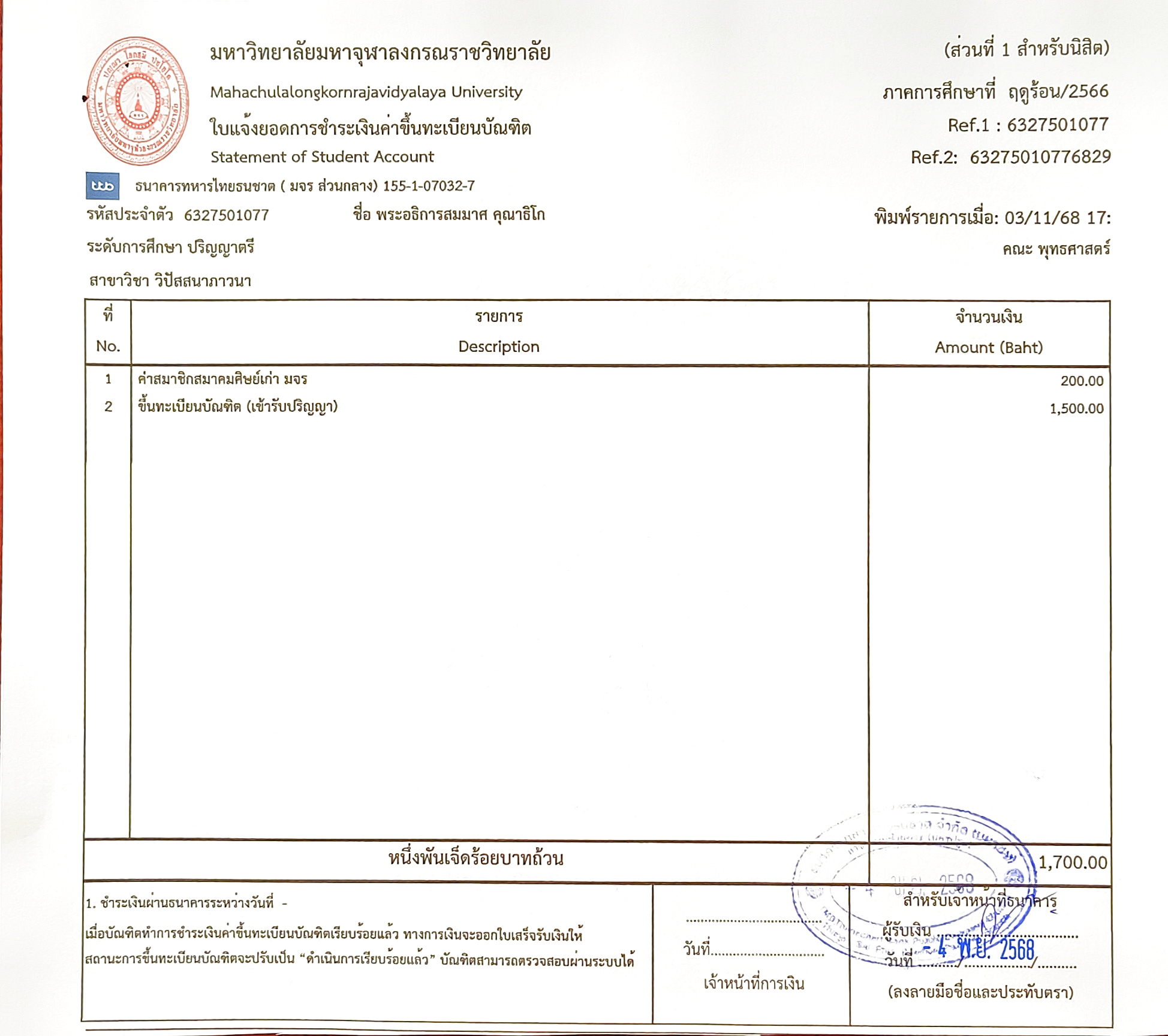 | สถานะเข้าพิธีประสาทปริญญา : บรรพชิต | ระดับ : ปริญญาตรี | สังกัดคณะ: คณะพุทธศาสตร์ | สาขาวิชา: วิปัสสนาภาวนา |