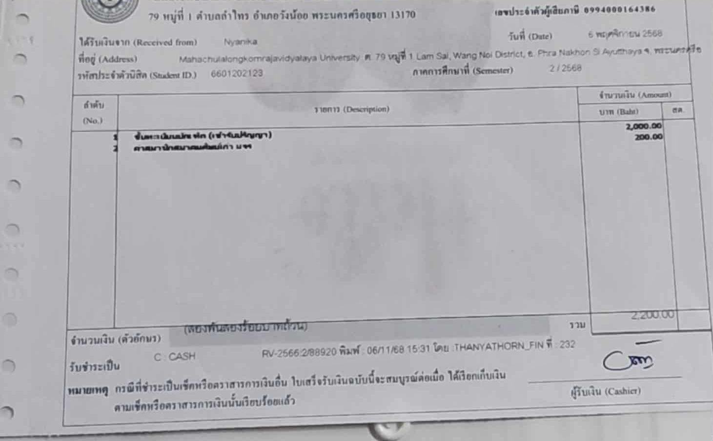 | รหัสนิสิต : 6601202123 | ชื่อ : Nyanika | ฉายา: - | นามสกุล: - |