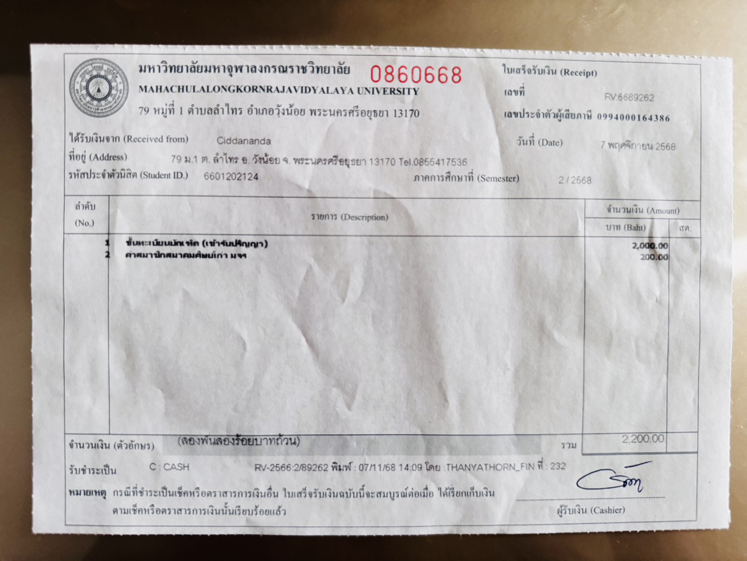 | รหัสนิสิต : 6601202124 | ชื่อ : Ciddananda | ฉายา: - | นามสกุล: - |