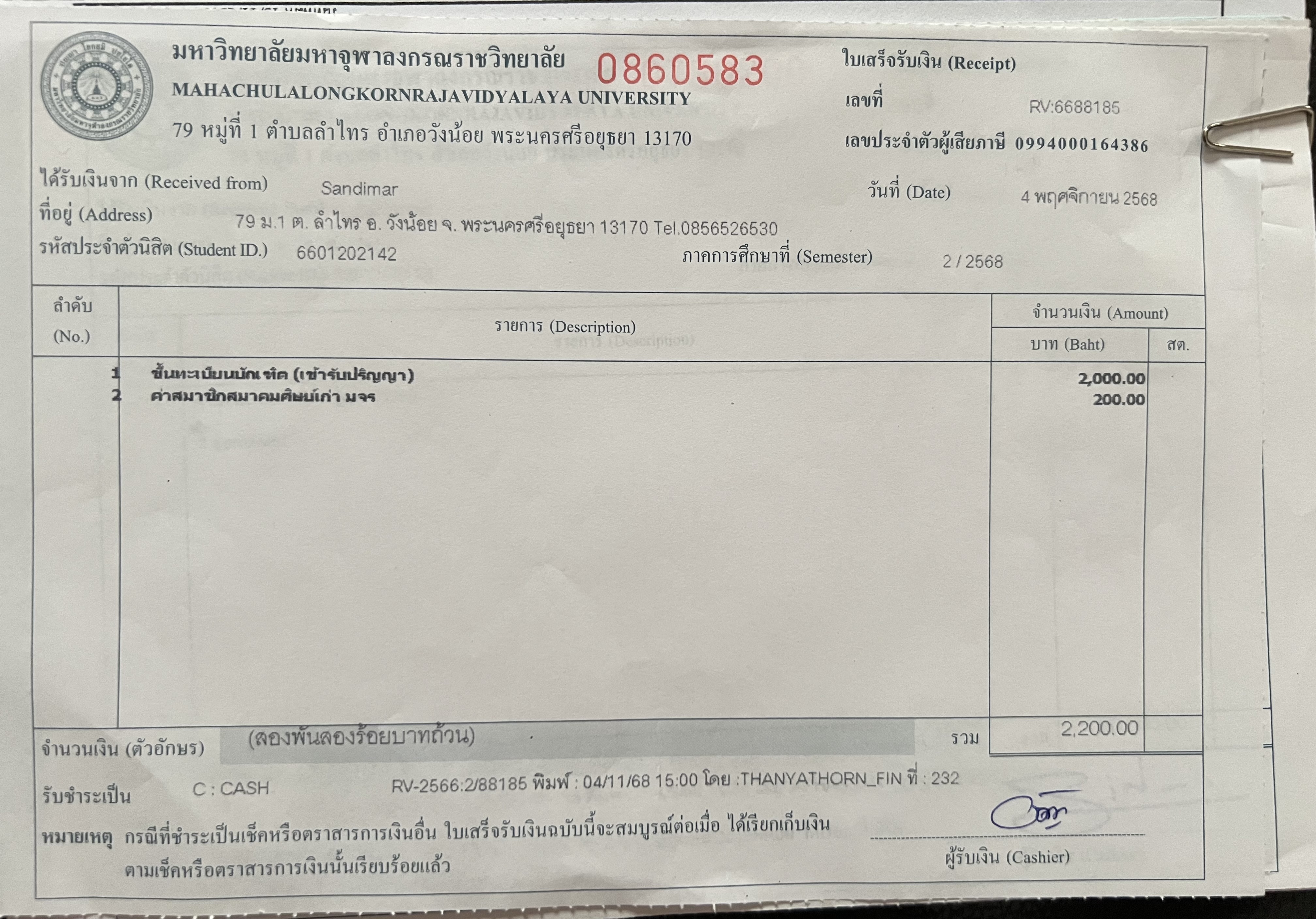 | รหัสนิสิต : 6601202142 | ชื่อ : Sandimar | ฉายา: - | นามสกุล: - |