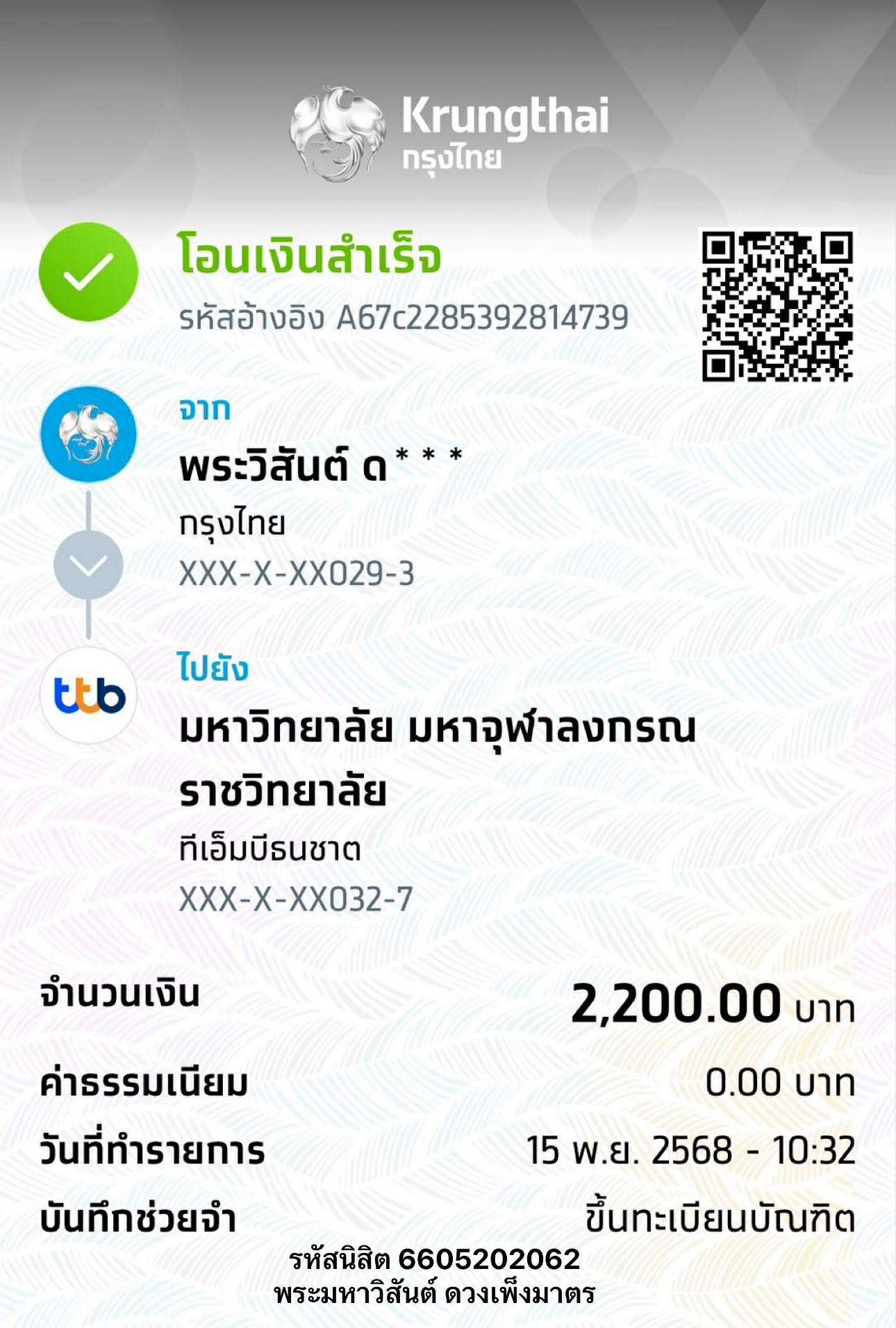 | รหัสนิสิต : 6605202062 | ชื่อ : พระมหาวิสันต์ | ฉายา: สาสนวิญฺญู | นามสกุล: ดวงเพ็งมาตร |