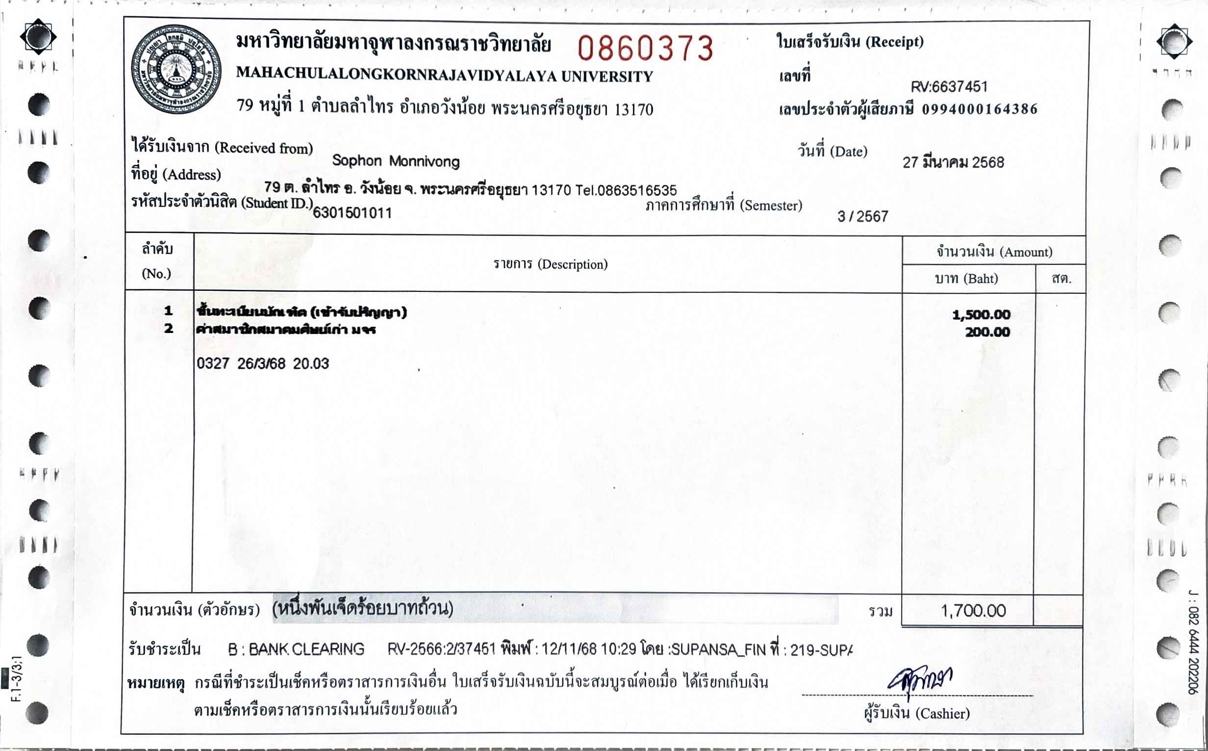 | รหัสนิสิต : 6301501011 | ชื่อ : Sophon Monnivong | ฉายา: - | นามสกุล: - |