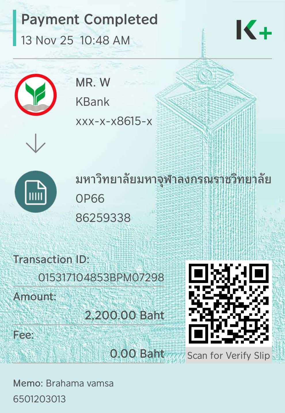 | รหัสนิสิต : 6501203013 | ชื่อ : Brahama Vamsa | ฉายา: - | นามสกุล: - |