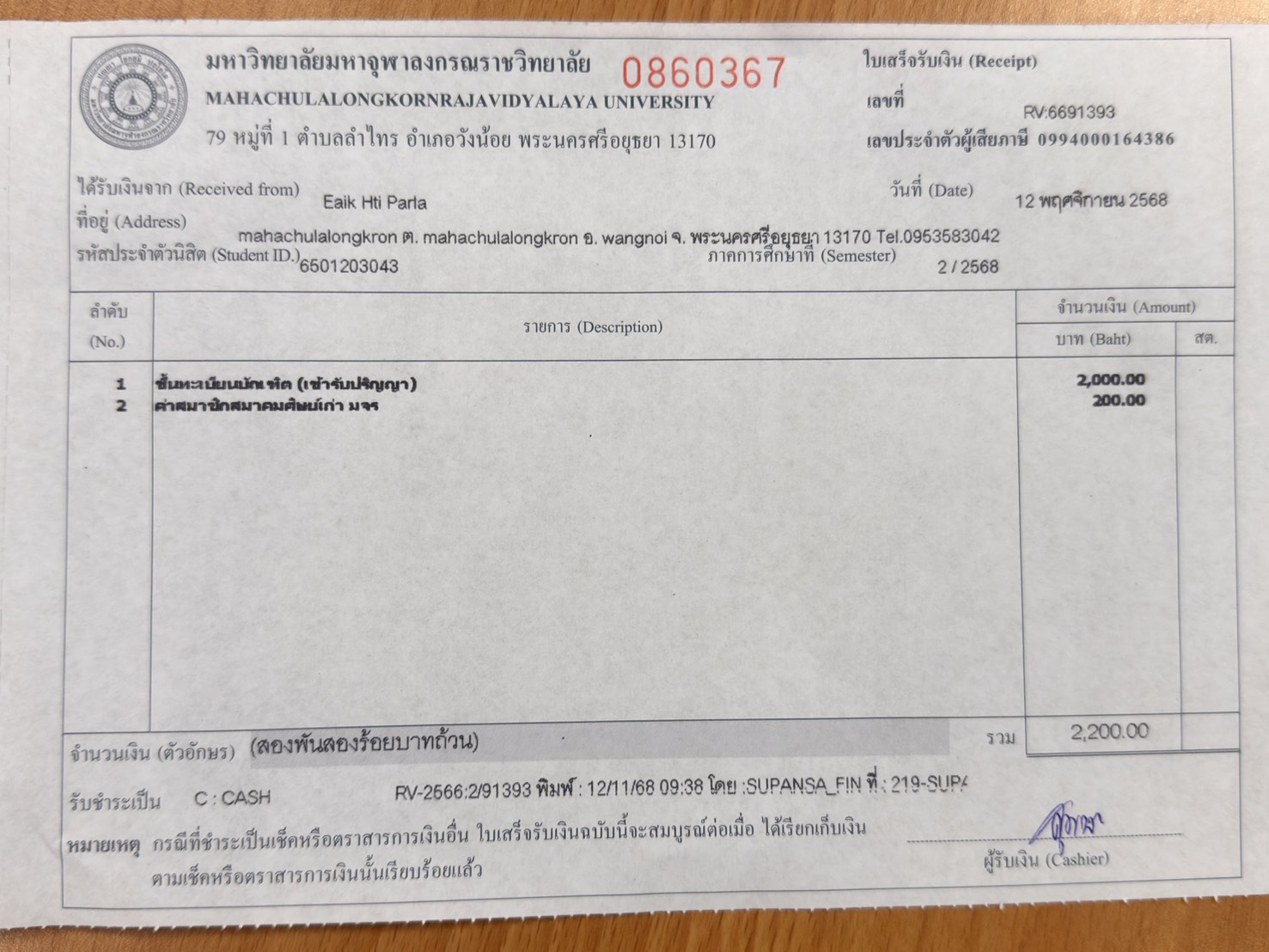 | รหัสนิสิต : 6501203043 | ชื่อ : Eaik Hti Parla | ฉายา: - | นามสกุล: - |