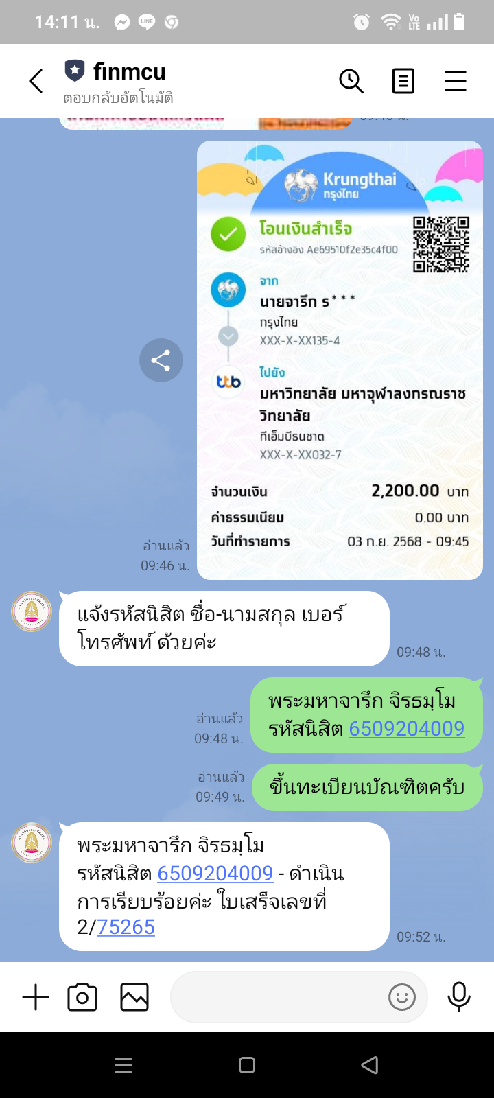 | รหัสนิสิต : 6509204009 | ชื่อ : พระมหาจารึก | ฉายา: จิรธมฺโม | นามสกุล: รุ่งเรือง |