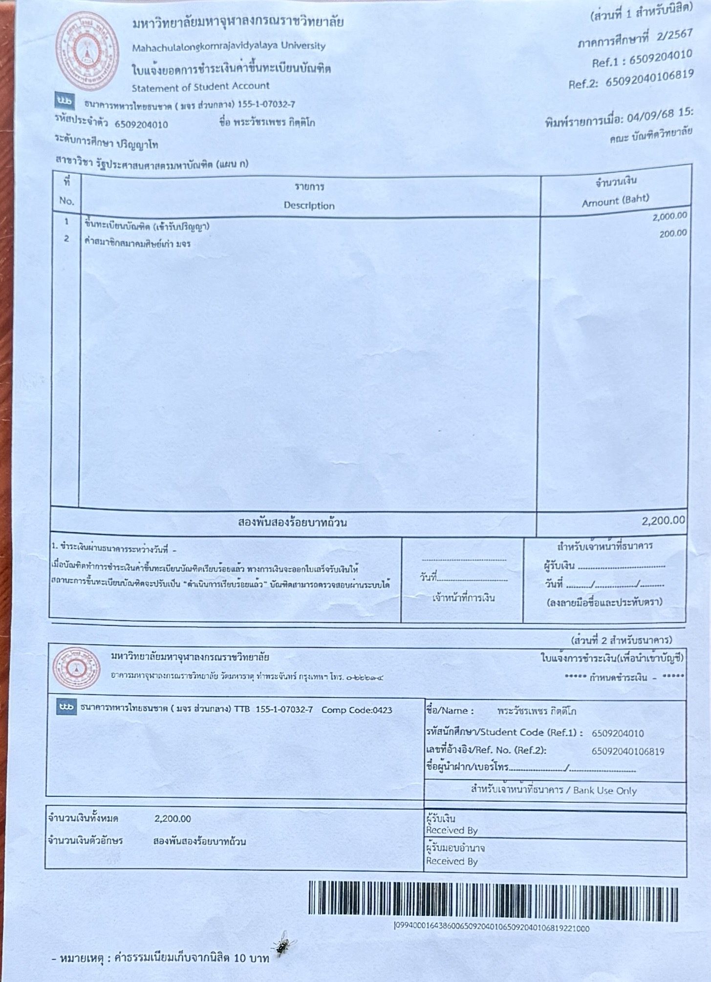 | รหัสนิสิต : 6509204010 | ชื่อ : พระวัชรเพชร | ฉายา: กิตฺติโก | นามสกุล: เสาวพันธ์ |