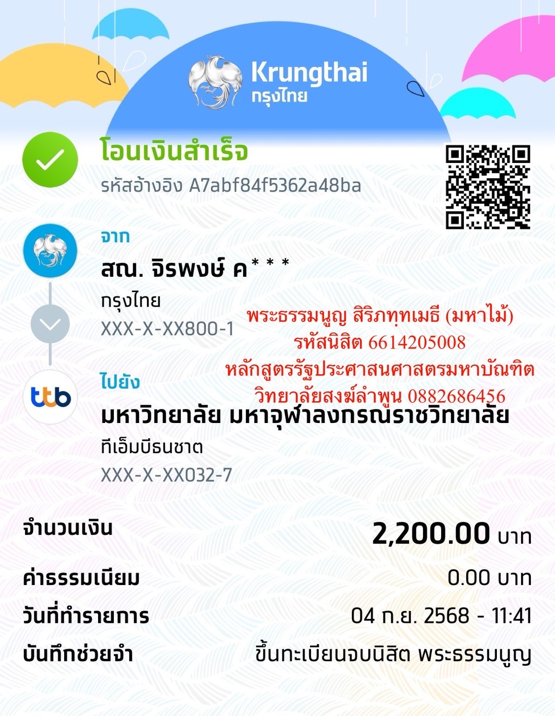 | สถานะเข้าพิธีประสาทปริญญา : บรรพชิต | ระดับ : ปริญญาโท | สังกัดคณะ: บัณฑิตวิทยาลัย | สาขาวิชา: รัฐประศาสนศาสตรมหาบัณฑิต |