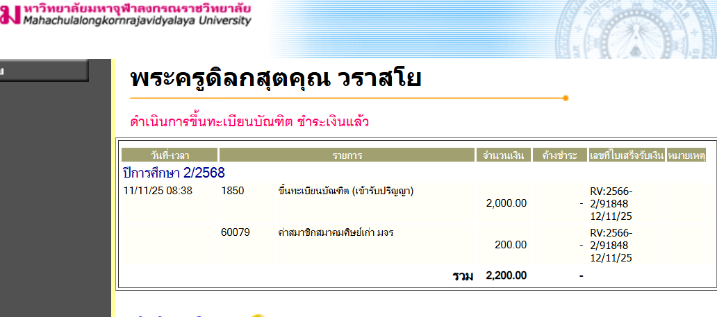 | รหัสนิสิต : 6627204001 | ชื่อ : พระครูดิลกสุตคุณ | ฉายา: วราสโย | นามสกุล: วงศ์พัตน์ |