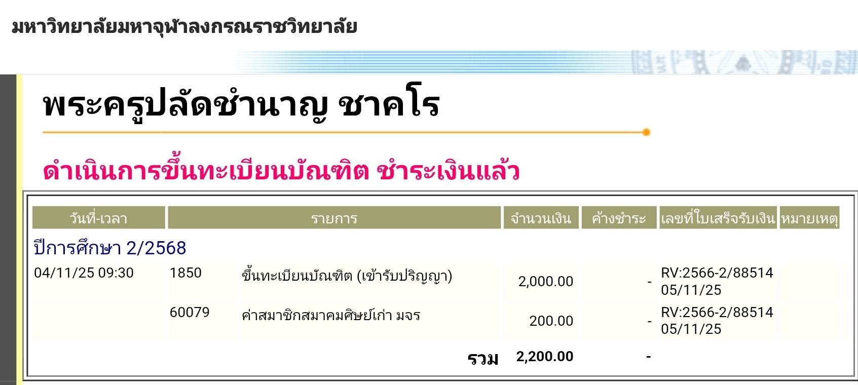 | รหัสนิสิต : 6627204007 | ชื่อ : พระครูปลัดชำนาญ | ฉายา: ชาคโร | นามสกุล: ใจดีเลิศ |