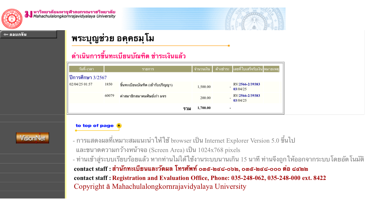 | สถานะเข้าพิธีประสาทปริญญา : บรรพชิต | ระดับ : ปริญญาตรี | สังกัดคณะ: คณะพุทธศาสตร์ | สาขาวิชา: พระพุทธศาสนา |