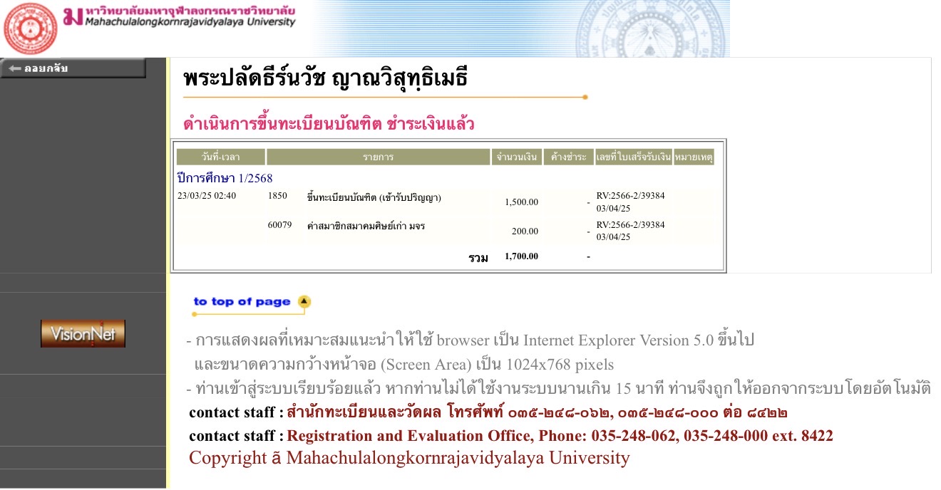 | สถานะเข้าพิธีประสาทปริญญา : บรรพชิต | ระดับ : ปริญญาตรี | สังกัดคณะ: คณะพุทธศาสตร์ | สาขาวิชา: พระพุทธศาสนา |