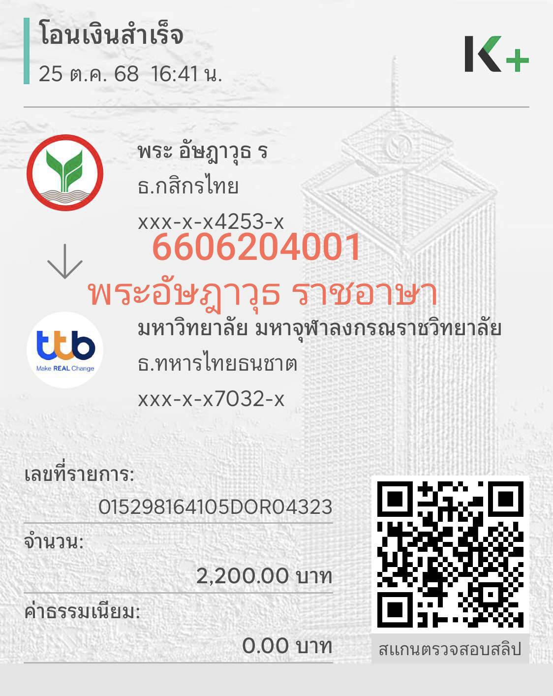 | รหัสนิสิต : 6606204001 | ชื่อ : พระอัษฎาวุธ | ฉายา: พฺรหฺมวํโส | นามสกุล: ราชอาษา |