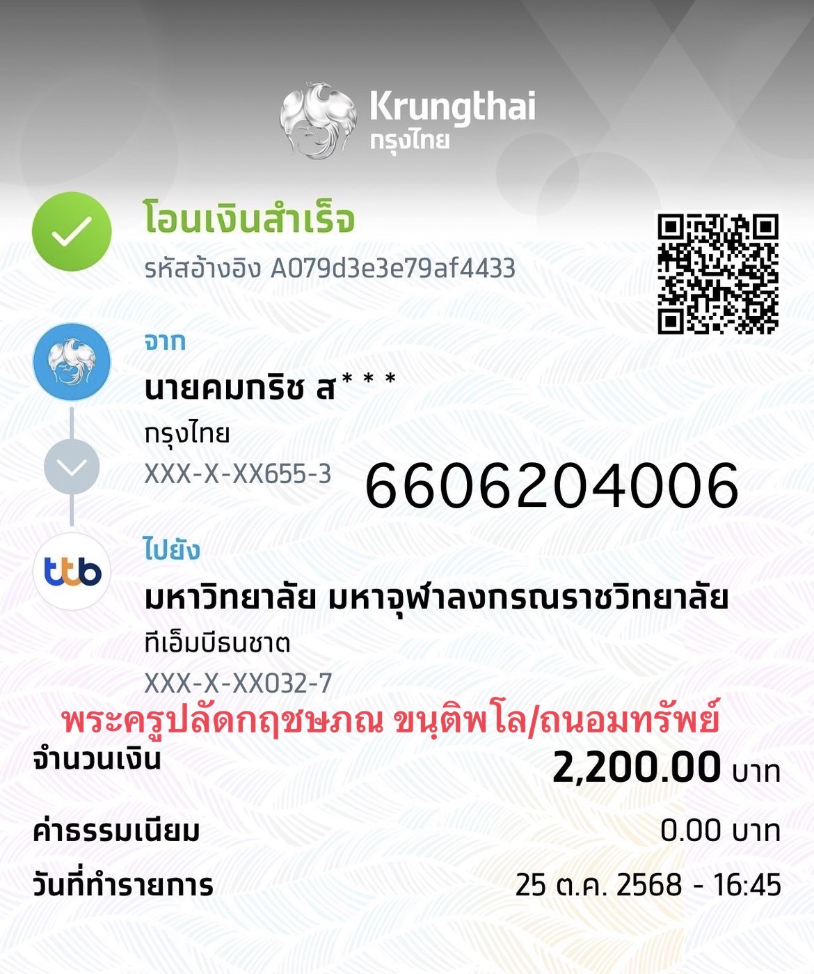 | รหัสนิสิต : 6606204006 | ชื่อ : พระครูปลัดกฤชษภณ | ฉายา: ขนฺติพโล | นามสกุล: ถนอมทรัพย์ |