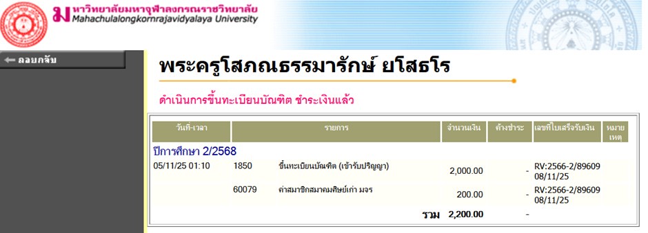 สถานะเข้าพิธีประสาทปริญญา : บรรพชิต ระดับ : ปริญญาโท สังกัดคณะ: บัณฑิตวิทยาลัย สาขาวิชา: รัฐศาสตรมหาบัณฑิต
