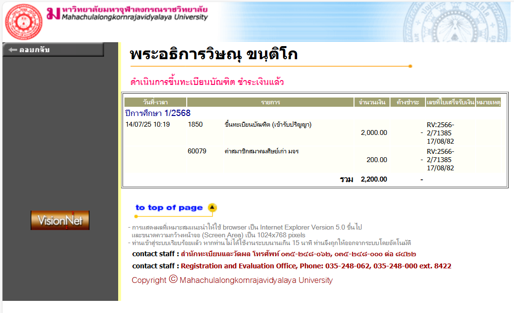 | รหัสนิสิต : 6630205003 | ชื่อ : พระอธิการวิษณุ | ฉายา: ขนฺติโก | นามสกุล: น้อยปิ่น |