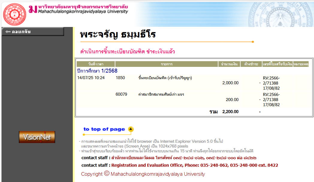 สถานะเข้าพิธีประสาทปริญญา : บรรพชิต ระดับ : ปริญญาโท สังกัดคณะ: บัณฑิตวิทยาลัย สาขาวิชา: การจัดการเชิงพุทธ