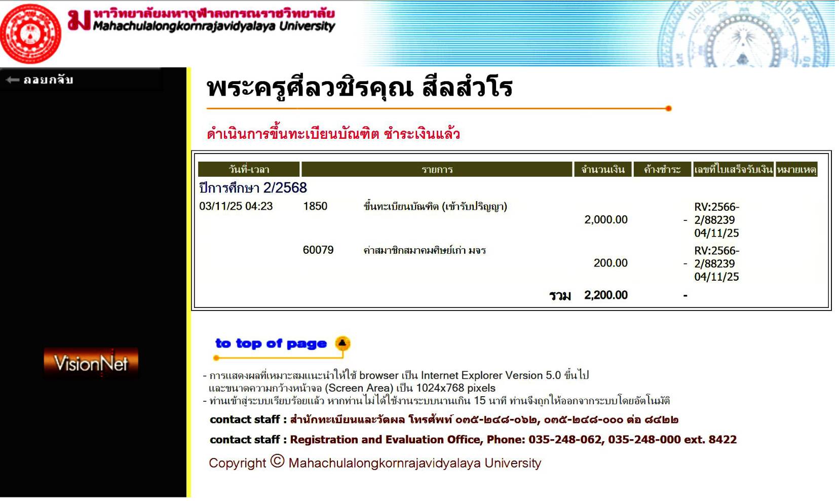 สถานะเข้าพิธีประสาทปริญญา : บรรพชิต ระดับ : ปริญญาโท สังกัดคณะ: บัณฑิตวิทยาลัย สาขาวิชา: การจัดการเชิงพุทธ