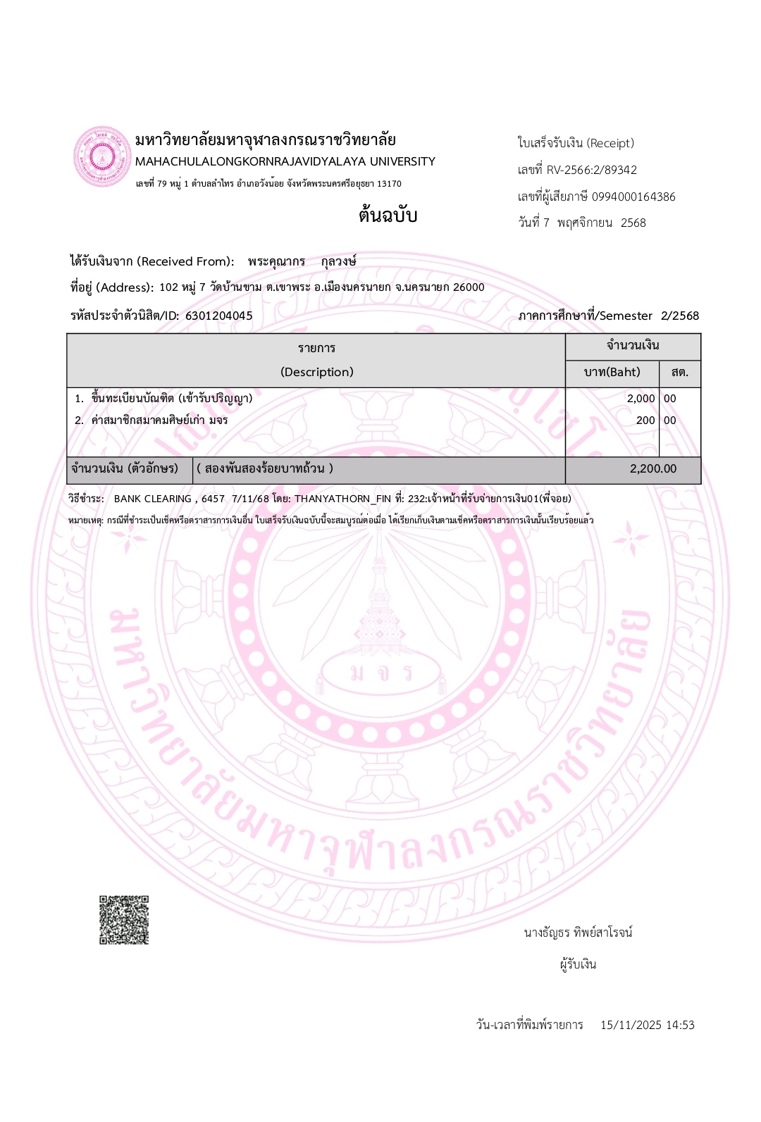 | รหัสนิสิต : 6301204045 | ชื่อ : พระคุณากร | ฉายา: ปิยจาโร | นามสกุล: กุลวงษ์ |