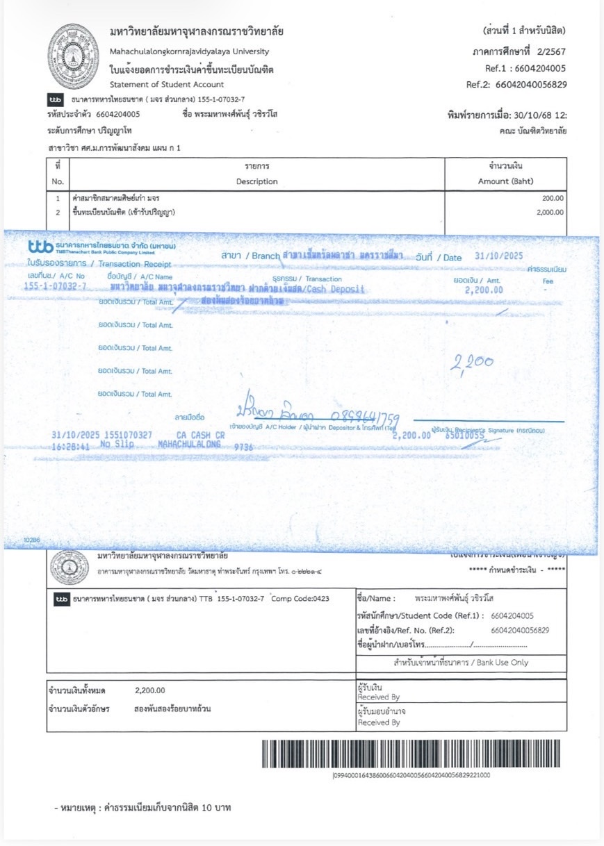 ใบเสร็จรับเงิน/เอกสารยืนยันการชำระเงิน(แนบเอกสาร)