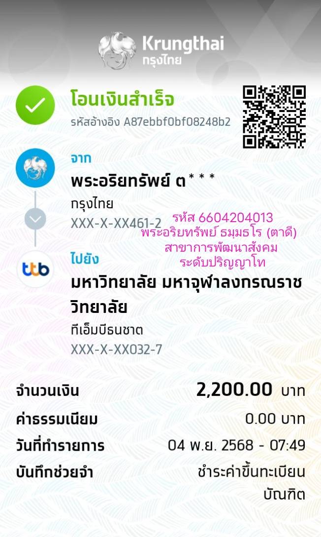 | รหัสนิสิต : 6604204013 | ชื่อ : พระอริยทรัพย์ | ฉายา: ธมฺมธโร | นามสกุล: ตาดี |