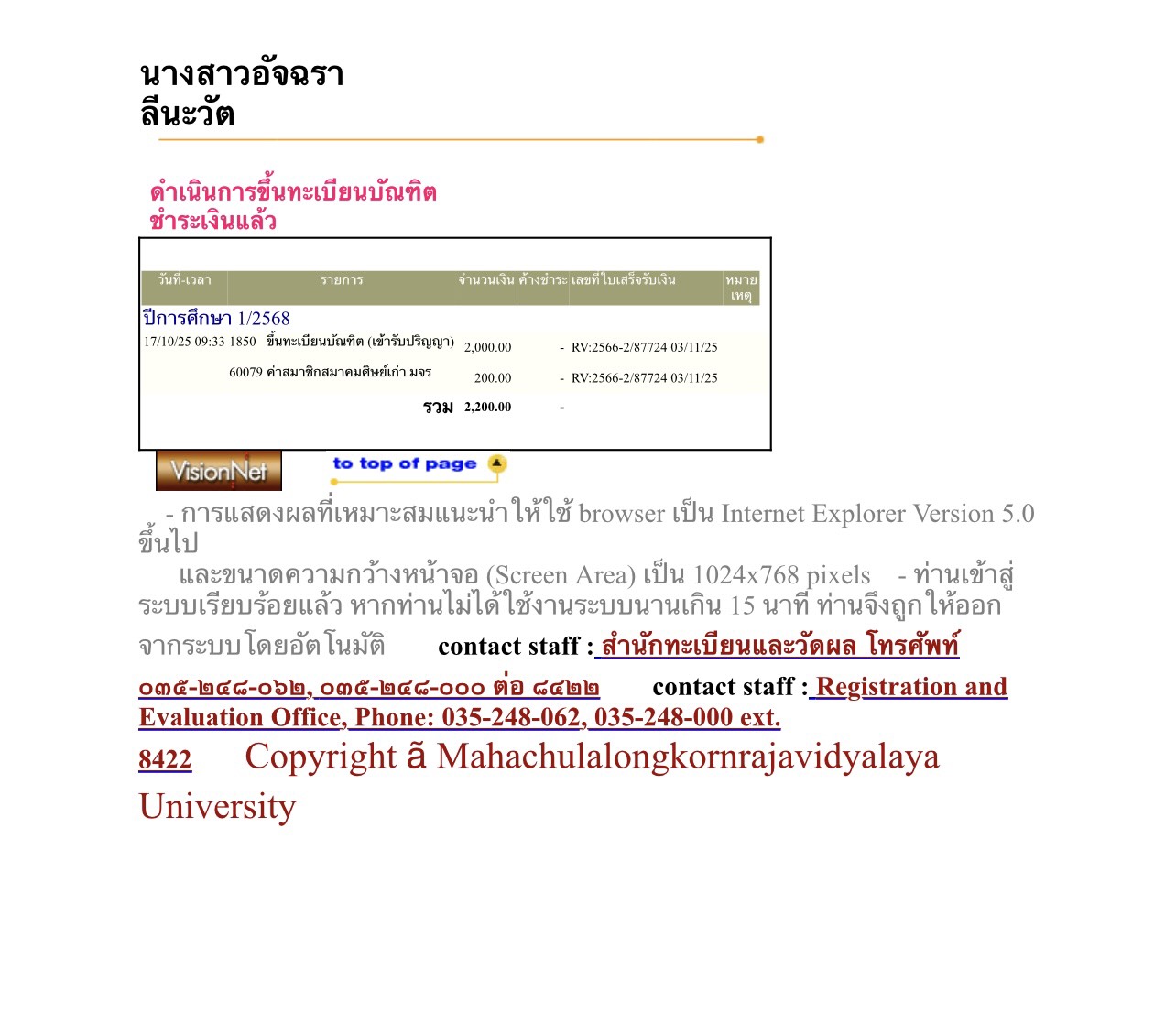 | รหัสนิสิต : 6601205034 | ชื่อ : นางสาวอัจฉรา | ฉายา: - | นามสกุล: ลีนะวัต |