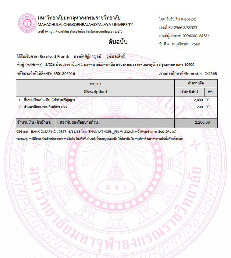ใบเสร็จรับเงิน/เอกสารยืนยันการชำระเงิน(แนบเอกสาร)