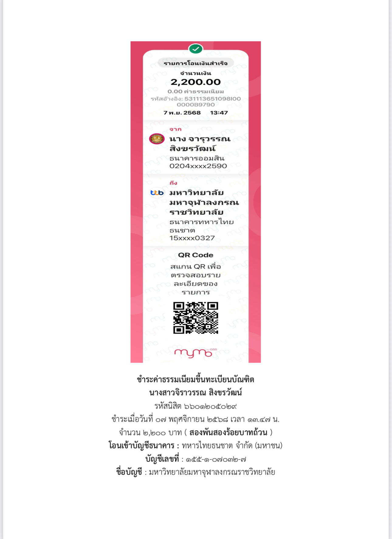 | รหัสนิสิต : 6601205029 | ชื่อ : นางสาวจิราวรรณ | ฉายา: - | นามสกุล: สิงขรวัฒน์ |