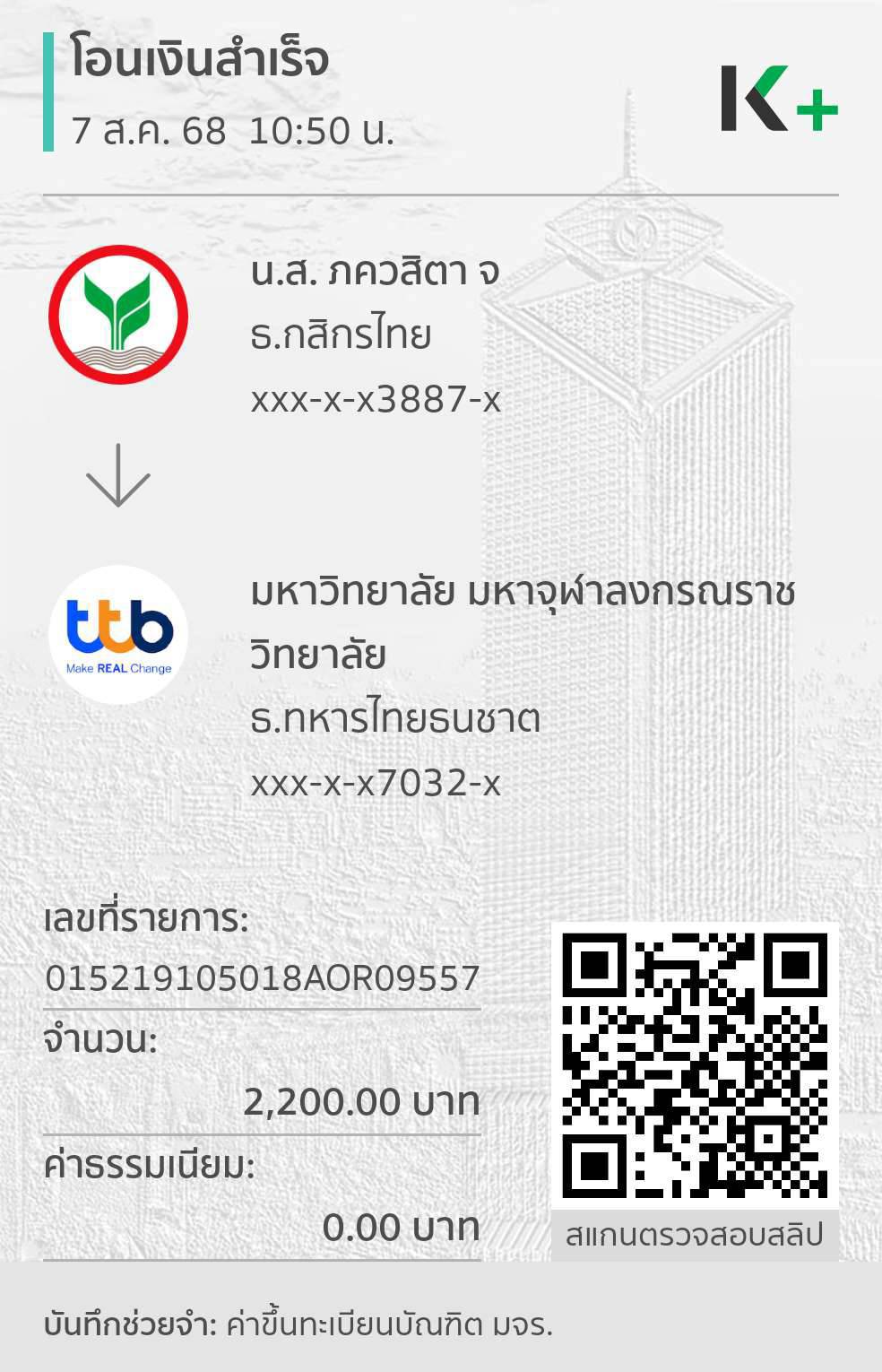 ใบเสร็จรับเงิน/เอกสารยืนยันการชำระเงิน(แนบเอกสาร)