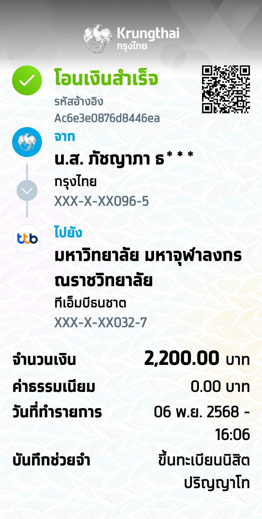 | รหัสนิสิต : 6601201063 | ชื่อ : นางสาวภัชญาภา | ฉายา: - | นามสกุล: ธนากฤตกษิดิศ |