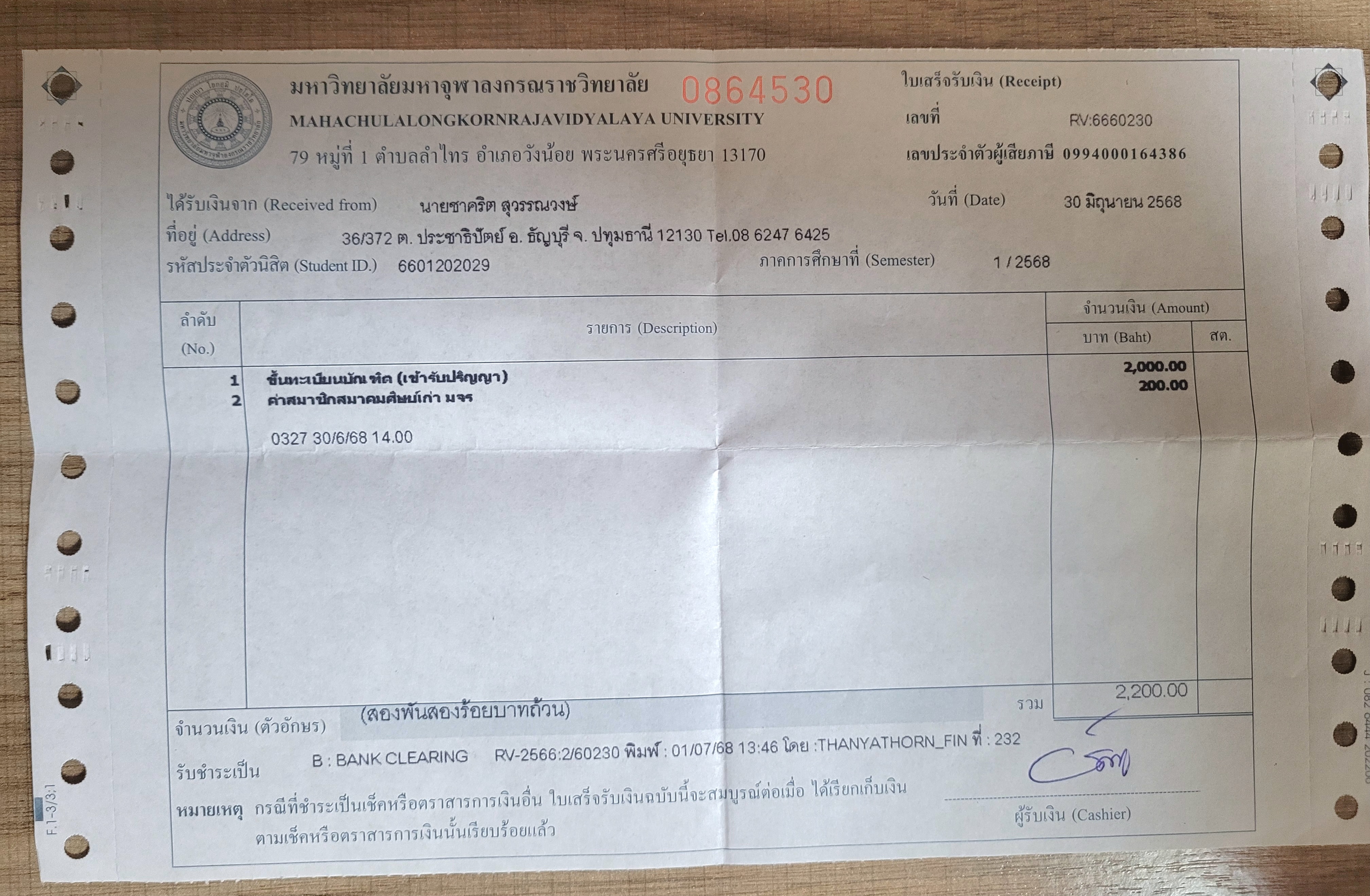 | รหัสนิสิต : 6601202029 | ชื่อ : นายชาคริต | ฉายา: - | นามสกุล: สุวรรณวงษ์ |