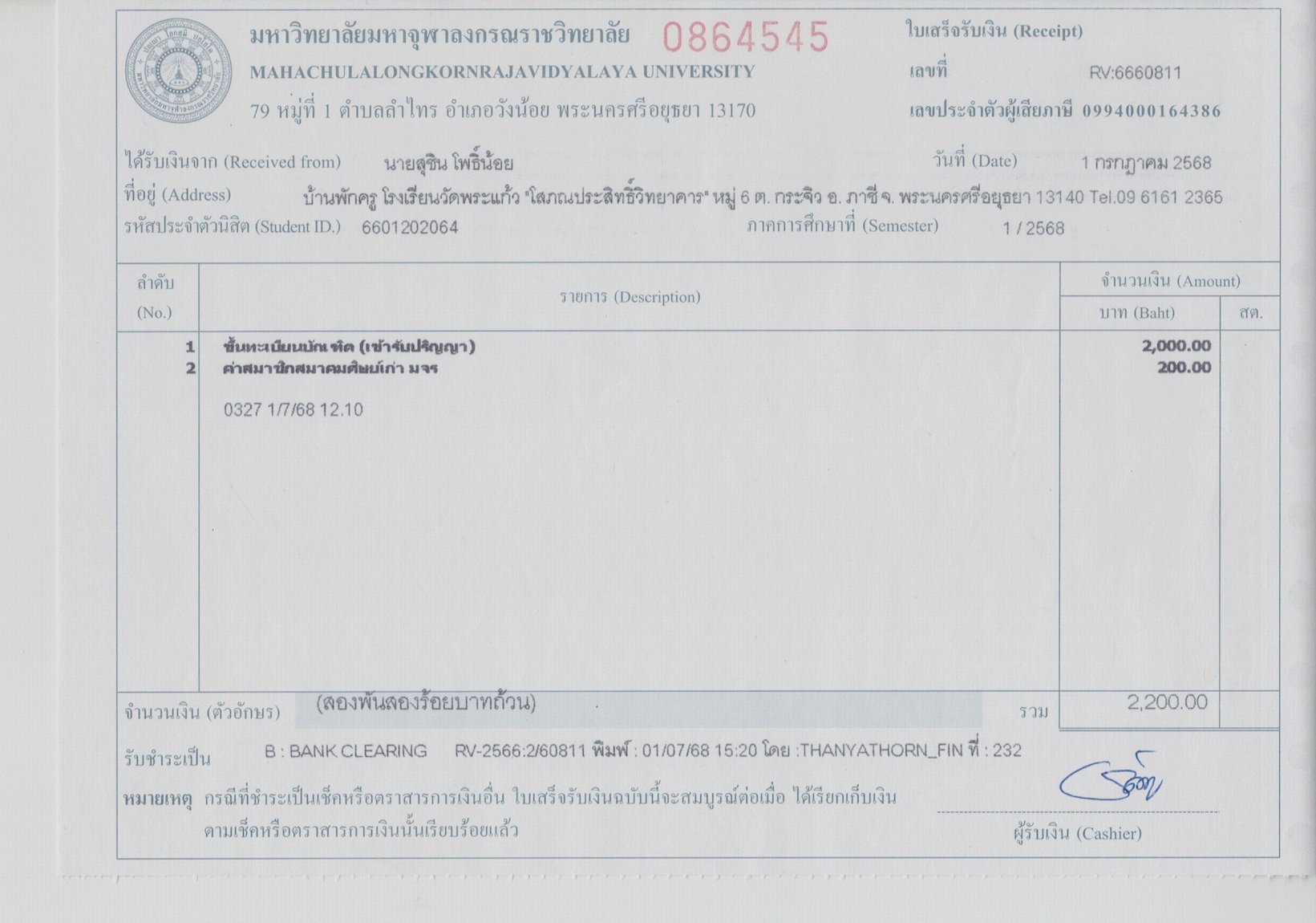 | รหัสนิสิต : 6601202064 | ชื่อ : นายสุชิน | ฉายา: - | นามสกุล: โพธิ์น้อย |