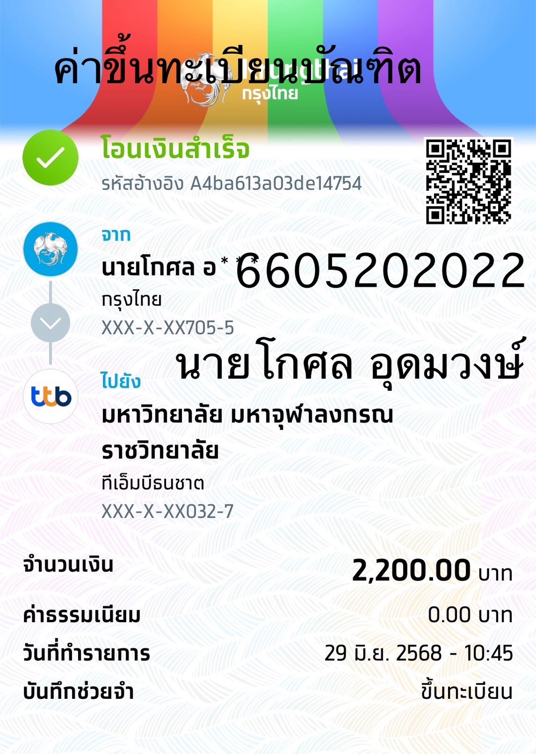| รหัสนิสิต : 6605202022 | ชื่อ : นายโกศล | ฉายา: - | นามสกุล: อุดมวงษ์ |