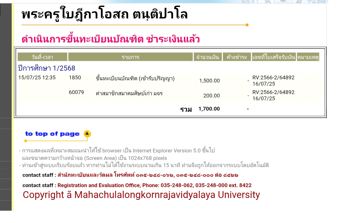 | สถานะเข้าพิธีประสาทปริญญา : บรรพชิต | ระดับ : ปริญญาตรี | สังกัดคณะ: คณะพุทธศาสตร์ | สาขาวิชา: พระพุทธศาสนา |
