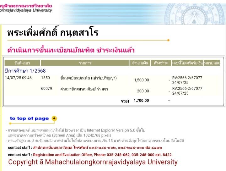 | สถานะเข้าพิธีประสาทปริญญา : บรรพชิต | ระดับ : ปริญญาตรี | สังกัดคณะ: คณะพุทธศาสตร์ | สาขาวิชา: พระพุทธศาสนา |
