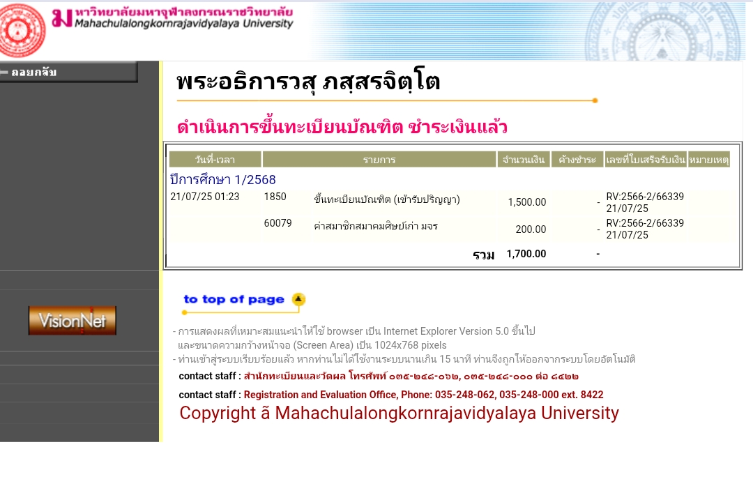 | สถานะเข้าพิธีประสาทปริญญา : บรรพชิต | ระดับ : ปริญญาตรี | สังกัดคณะ: คณะพุทธศาสตร์ | สาขาวิชา: พระพุทธศาสนา |