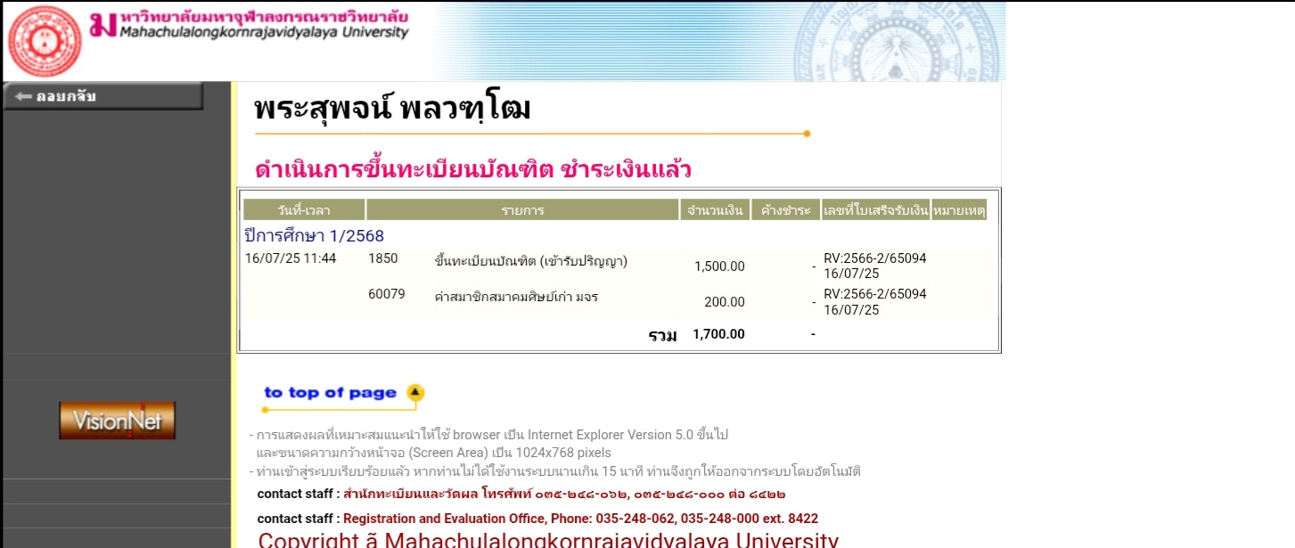 | สถานะเข้าพิธีประสาทปริญญา : บรรพชิต | ระดับ : ปริญญาตรี | สังกัดคณะ: คณะพุทธศาสตร์ | สาขาวิชา: พระพุทธศาสนา |