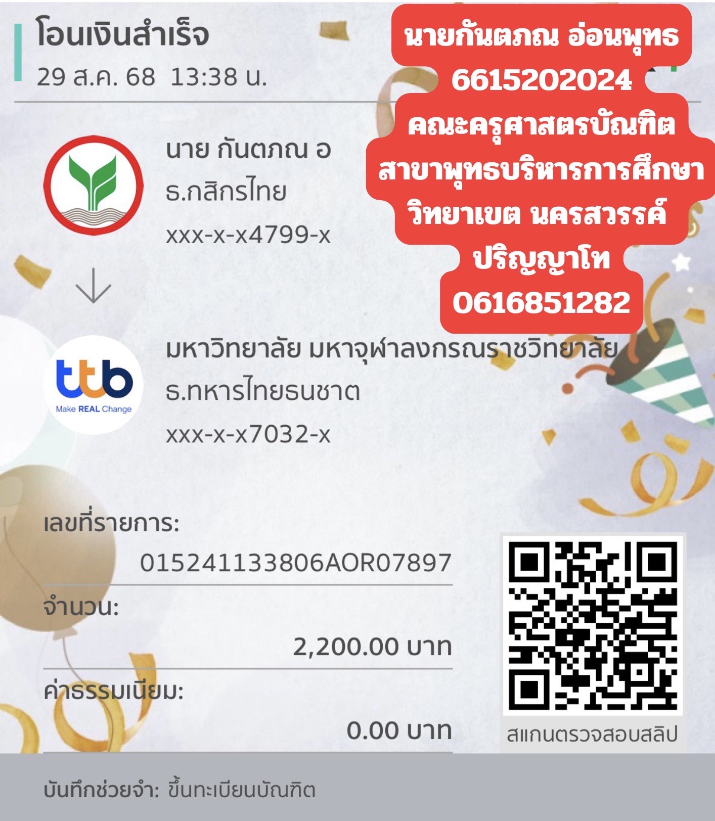 รหัสนิสิต : 6615202024 ชื่อ : นายกันตภณ ฉายา: - นามสกุล: อ่อนพุทธ