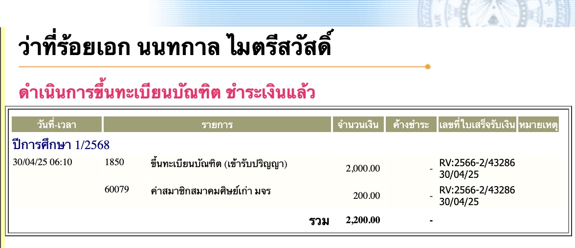 | รหัสนิสิต : 6612202031 | ชื่อ : ว่าที่ร้อยเอก นนทกาล | ฉายา: - | นามสกุล: ไมตรีสวัสดิ์ |