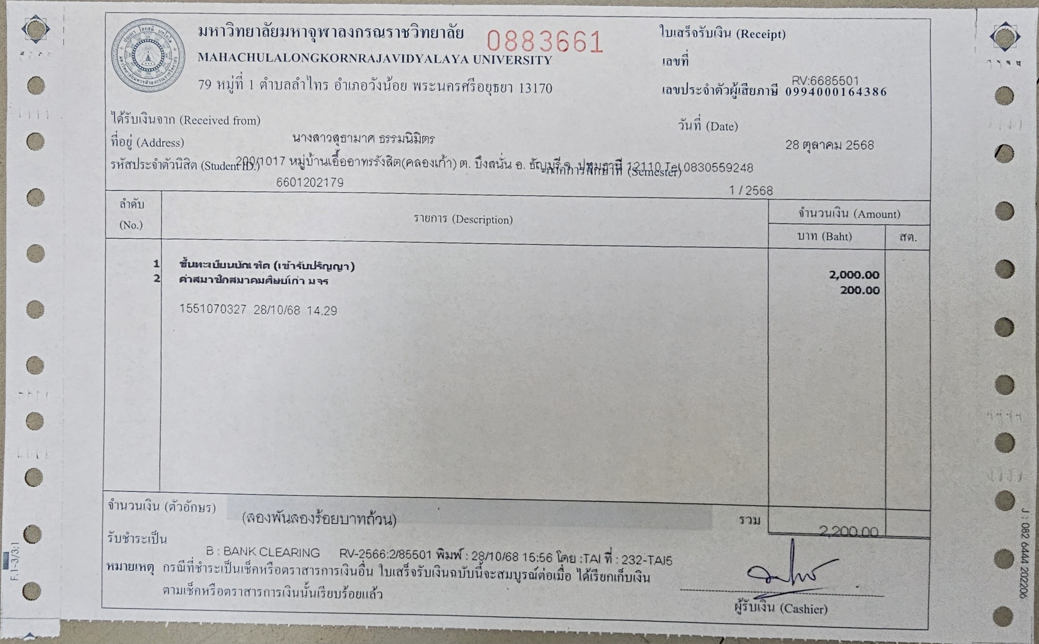 | รหัสนิสิต : 6601202179 | ชื่อ : นางสาวสุธามาศ | ฉายา: - | นามสกุล: ธรรมนิมิตร |