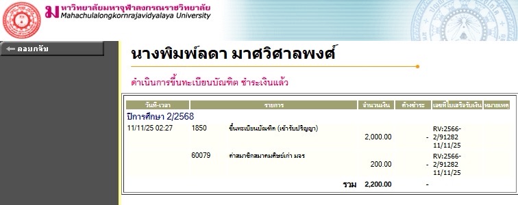 | รหัสนิสิต : 6601203103 | ชื่อ : นางพิมพ์ลดา | ฉายา: - | นามสกุล: มาศวิศาลพงศ์ |