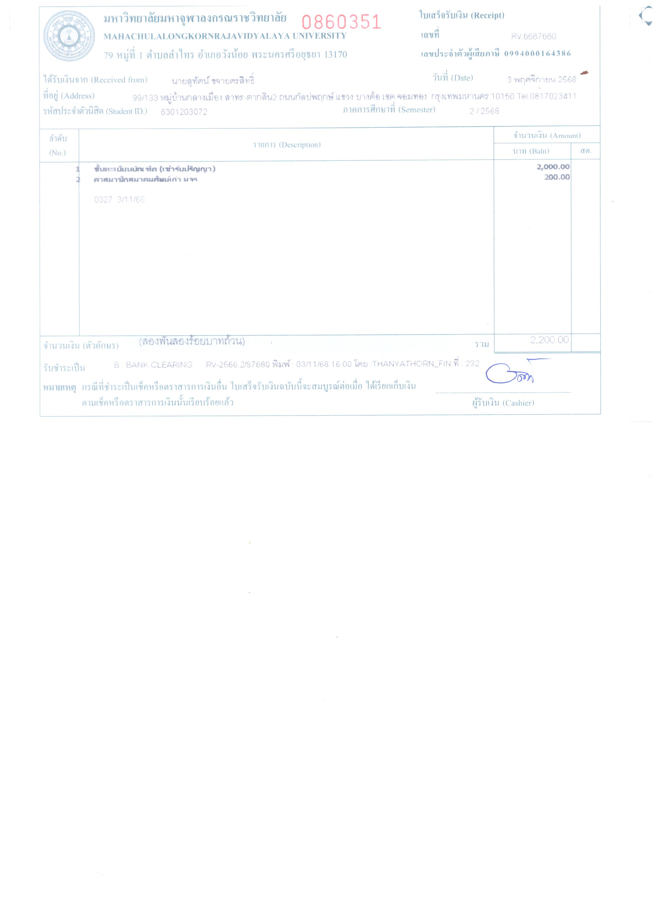 ใบเสร็จรับเงิน/เอกสารยืนยันการชำระเงิน(แนบเอกสาร)