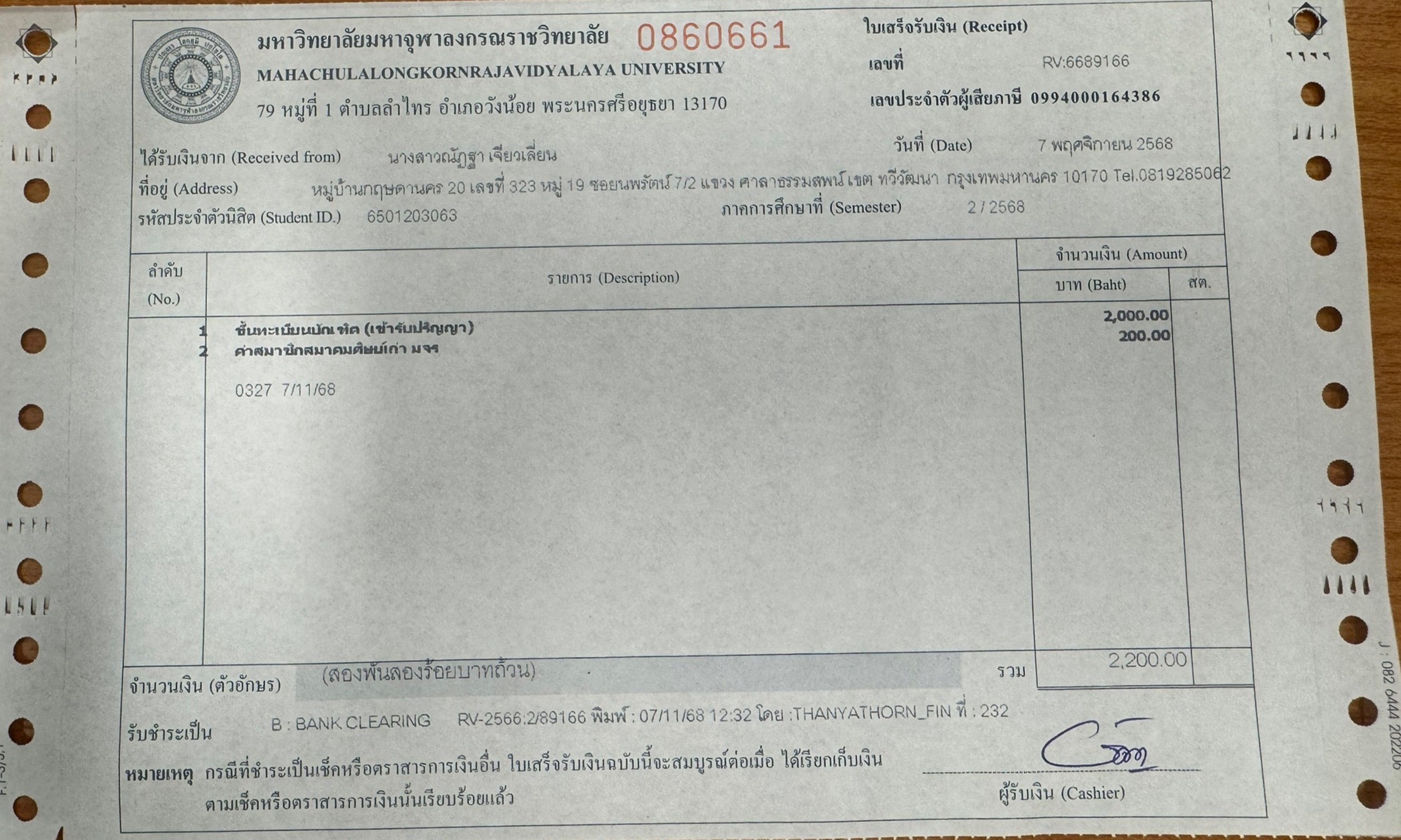 | รหัสนิสิต : 6501203063 | ชื่อ : นางสาวณัฏฐา | ฉายา: - | นามสกุล: เจียวเลี่ยน |