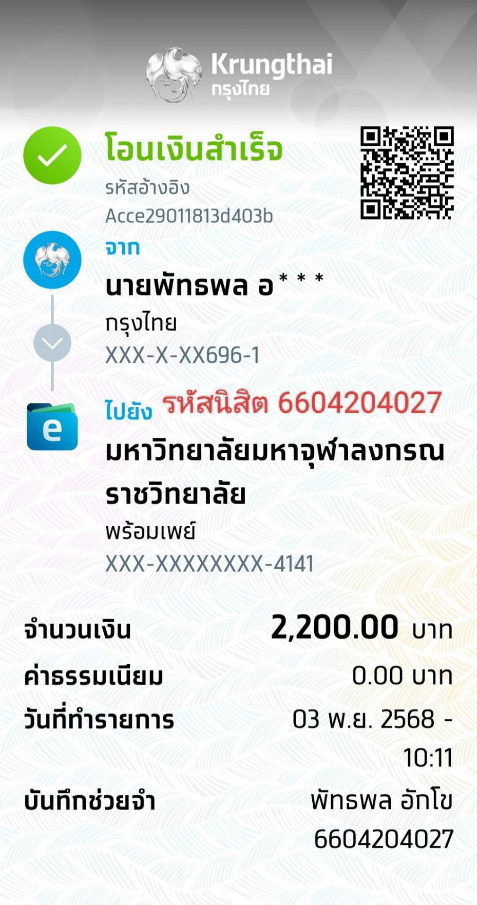 | รหัสนิสิต : 6604204027 | ชื่อ : นายพัทธพล | ฉายา: - | นามสกุล: อักโข |