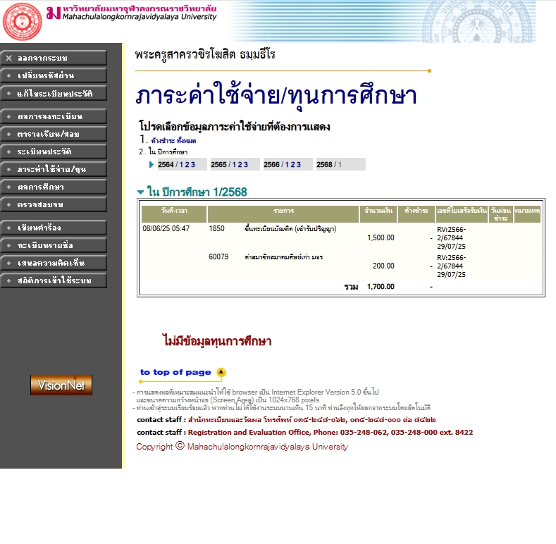 | สถานะเข้าพิธีประสาทปริญญา : บรรพชิต | ระดับ : ปริญญาตรี | สังกัดคณะ: คณะพุทธศาสตร์ | สาขาวิชา: พระพุทธศาสนา |