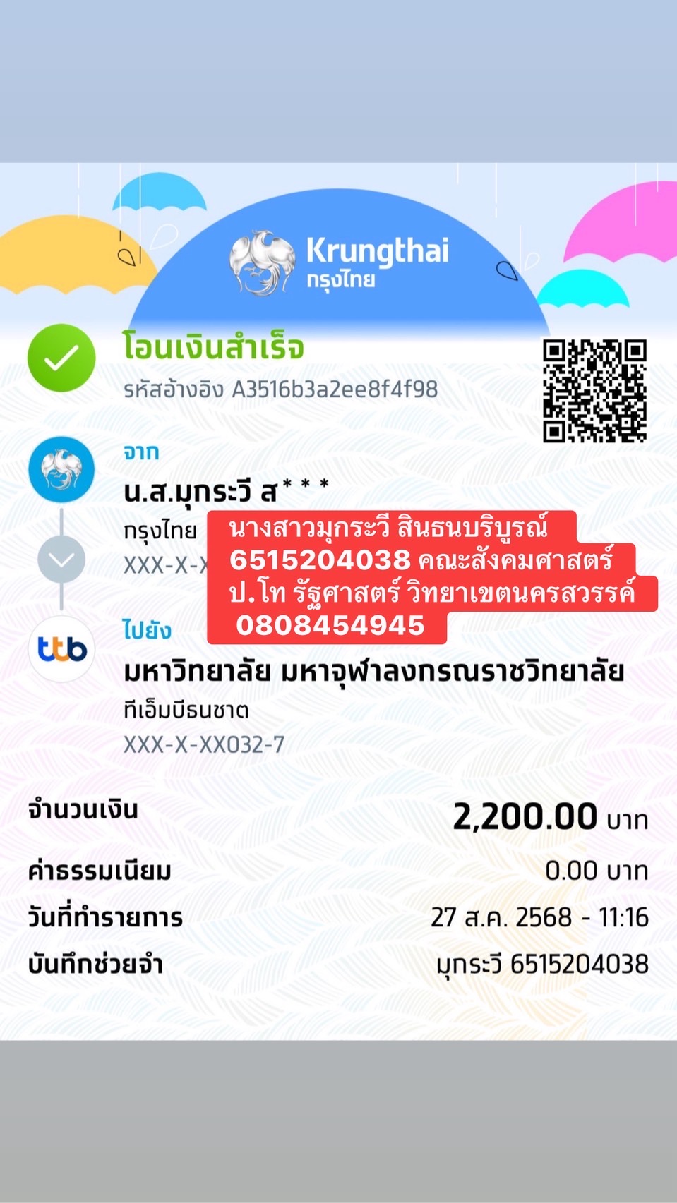 | รหัสนิสิต : 6515204038 | ชื่อ : นางสาวมุกระวี | ฉายา: - | นามสกุล: สินธนบริบูรณ์ |