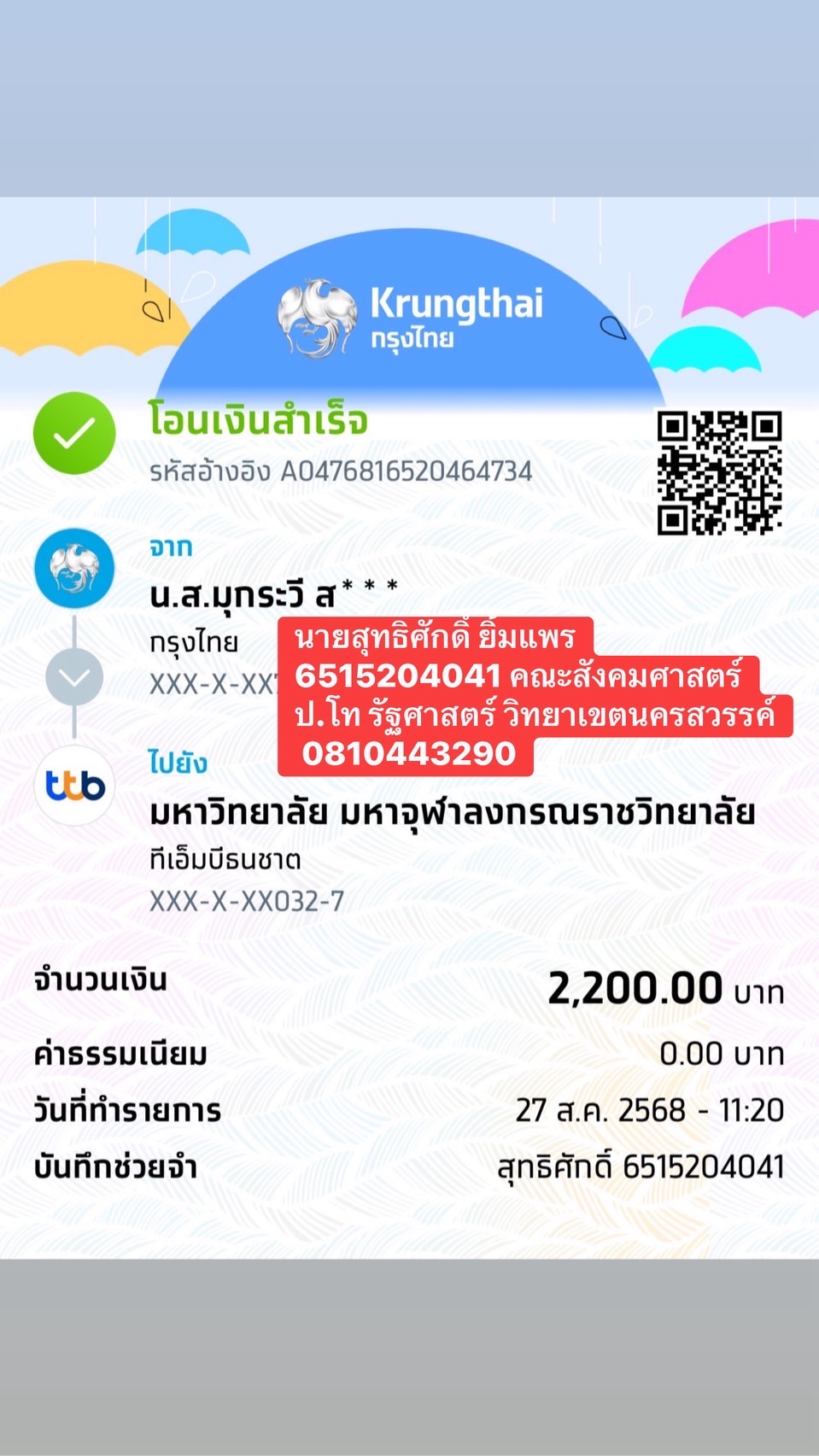 | รหัสนิสิต : 6515204041 | ชื่อ : นายสุทธิศักดิ์ | ฉายา: - | นามสกุล: ยิ้มแพร |