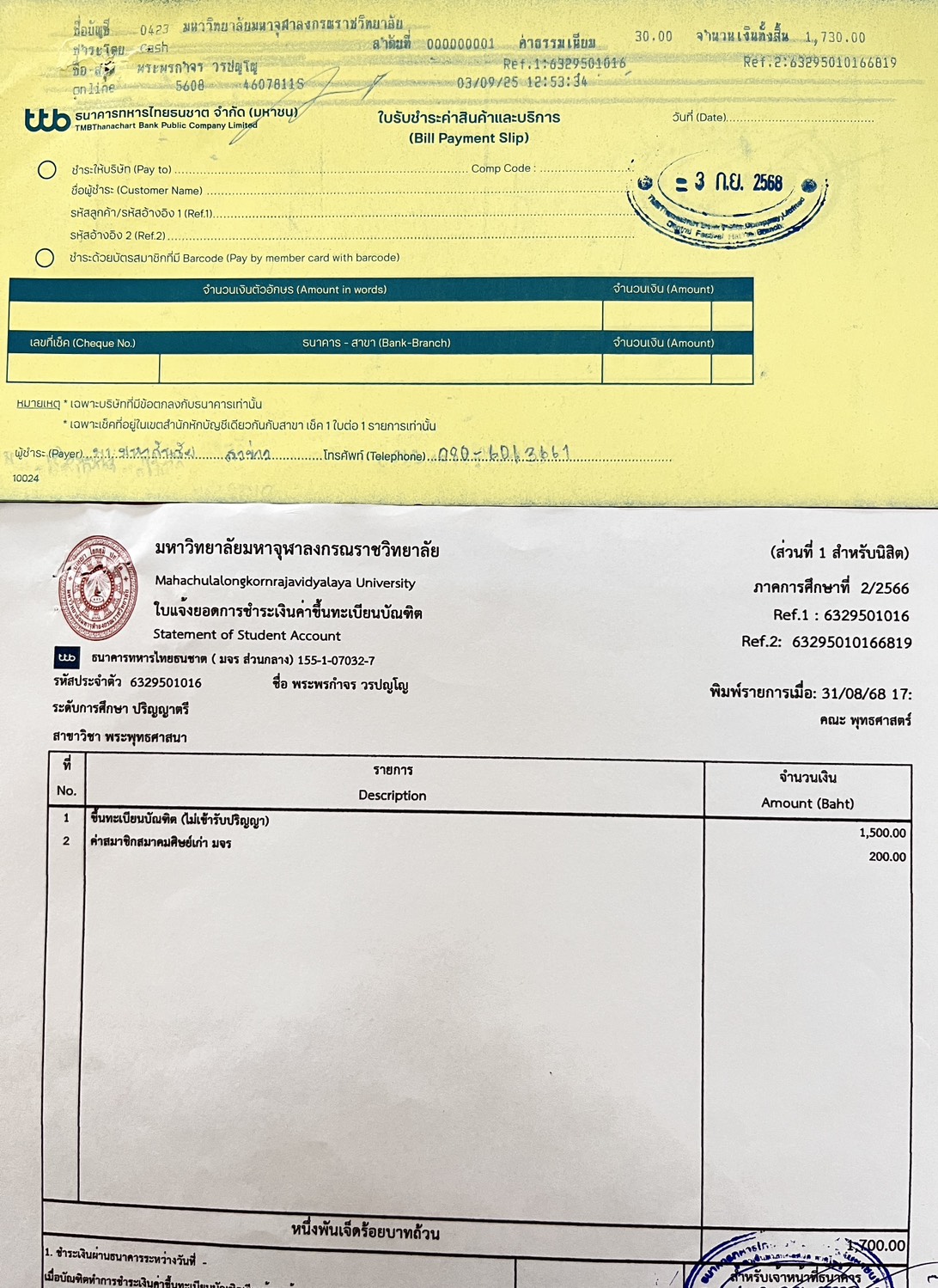 สถานะเข้าพิธีประสาทปริญญา : บรรพชิต ระดับ : ปริญญาตรี สังกัดคณะ: คณะพุทธศาสตร์ สาขาวิชา: พระพุทธศาสนา
